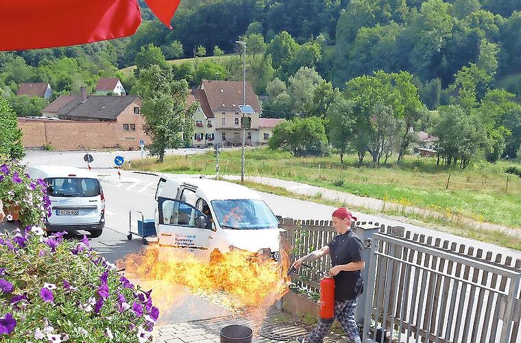 Es war beeindruckend, was Kreisbrandmeister Markus Wolf und Feuerwehrmann Christian Dennerlein vor der Tagespflege der Diakonie Bamberg-Forchheim inszenierten. Ganz praktisch erklärten sie den Mitarbeitern den Umgang mit dem Feuerlöscher – an einem offenen Feuer. Die beiden Feuerwehrmänner demonstrierten bei dieser Brandschutzübung außerdem, wie erhitztes Öl oder Fett in Verbindung mit kleinsten Mengen Wasser schlagartig verpufft und sich schnell ein sogenannter Fettbrand entwickeln kann. Auch wie eine Spraydose explodieren kann, wenn sie zu lange zu großer Hitze ausgesetzt wird, erlebten die Mitarbeiter. „Es war eine beeindruckende Übung für uns“, staunte Cornelia Dorsch, leitende Pflegefachkraft der Tagespflege Mostviel . Ihre Kollegin Gabriele Heid, selbst aktive Feuerwehrfrau, hatte die Idee zu dieser ausführlichen Brandschutzübung. „Jetzt kennt sich jeder unserer Mitarbeitenden wirklich aus, wenn es jemals zum Ernstfall kommen sollte. Und wir wissen auch, wie wir Gefahren vermeiden können.“ red