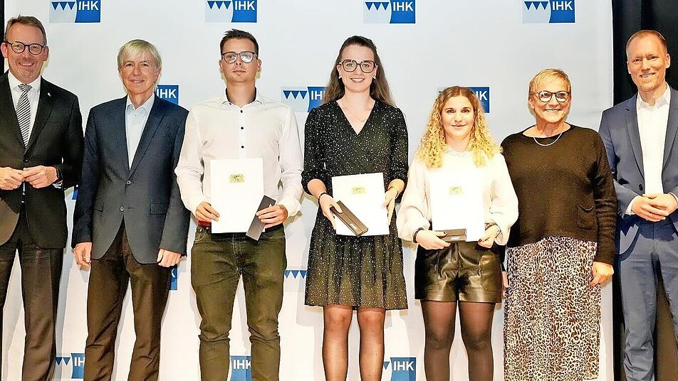 IHK-Hauptgeschäftsführer Wolfram Brehm, der oberfränkische Regierungsvizepräsident Thomas Engel (v. l.) sowie IHK-Vizepräsident Michael Bitzinger und die stellvertretende Landrätin Rosi Kraus (v.r.) gratulierten den Meisterpreisträgern (v. l.) Jan...