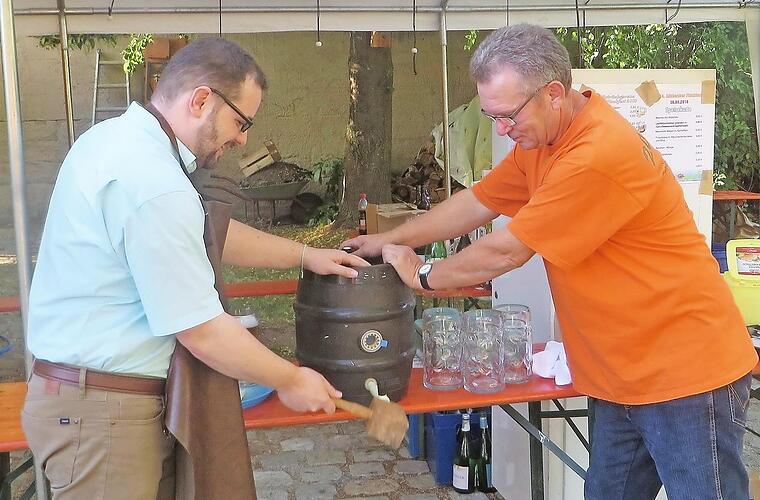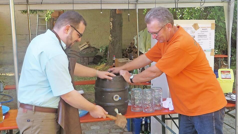 Ailsbach beim Hirtenhaus ihr traditionelles Fischfest. Bei herrlichem Sonnenschein war das Fest in der Mitte des Dorfes sehr gut besucht. Unter den Gästen weilte auch Bürgermeister Stefan Himpel (Freie Wähler Lonnerstadt). Assistieren musste er beim Bieranstich allerdings nicht. Denn der Landtagskandidat der Freien Wähler für den Kreis Erlangen-Höchstadt, Christian Enz, erledigte seinen ersten Bieranstich souverän. Bereits beim zweiten Schlag lief der Gerstensaft.