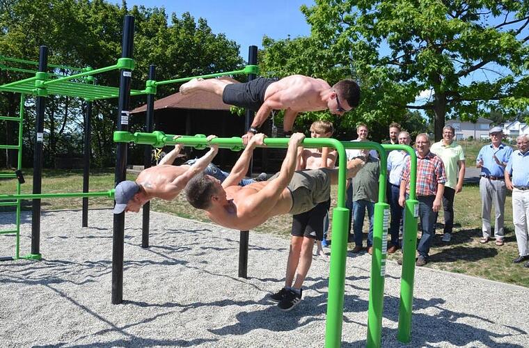 "Die Anlage ist wirklich optimal", lobte Oliver Otto, der mit einigen Sportfreunden dem Bausenat vorführte, was unter Calisthenics zu verstehen ist. "Alle Übungen lassen sich von Grund auf nach und nach aufbauen, damit ist das Training auch für Ungeübte möglich", erklärte Otto. So kann etwa der Klimmzug zunächst in der Schräge trainiert werden, wobei die Füße am Boden bleiben. Durch langsame Steigerung kommt der Sportler dann zum eigentlichen freien Klimmzug.