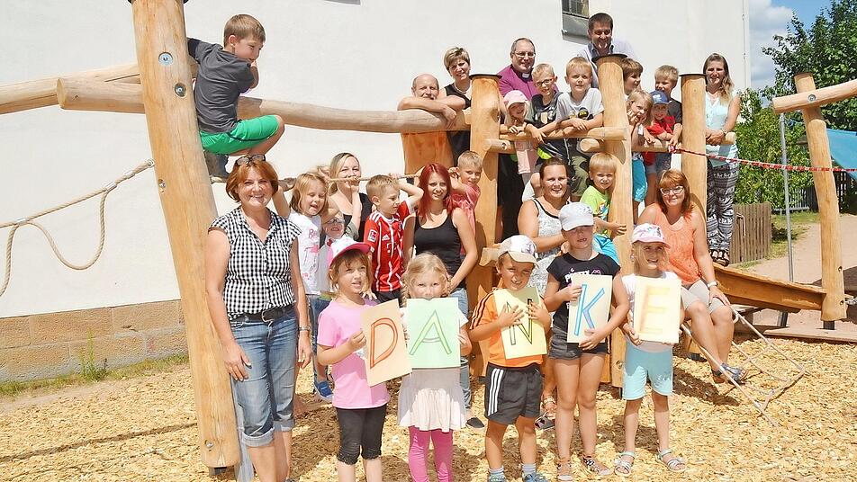 Große Freude herrschte bei der Übergabe eines neuen Mehrzweckspielgerätes im Kindergarten "Fridolin" in Hummendorf. Doch bevor man den Spaß an diesem multifunktionalen Spielgeräten auskosten konnte, g...
