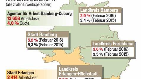Im Stadtgebiet Bamberg nahm die Zahl der Arbeitslosen um vier Personen zu. Sie betrug Ende Februar 2024. Gegenüber Februar 2015 waren es ebenso vier Personen mehr. Die Arbeitslosenquote betrug 5,2 Prozent (Vorjahr 5,3 Prozent). Im Berichtsmonat meldeten die Arbeitgeber aus dem Stadtgebiet 430 Stellen.