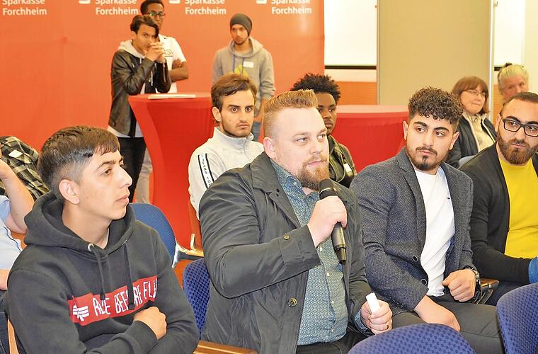 Kfz-Meister Oliver Markeli, der in Nürnberg eine Werkstatt betreibt, berichtet in der Podiumsdiskussion der Forchheimer Wirtschaftsjunioren und des "Netzwerks Unternehmen integrieren Flüchtlinge" ebenfalls von einer Odyssee der Behördengänge: Sein Mitarbeiter Fahim Rasaoli aus Afghanistan nahm an einer Einstiegsqualifizierung teil. Als er dann eine Ausbildung zum Kfz-Mechatroniker beginnen wollte, erhielt der heute 20-Jährige aber keine Arbeitserlaubnis. Er durfte lediglich die Berufsschule besuchen. Seit 1. Februar hat er die Arbeitsgenehmigung in der Tasche, befristet auf drei Monate. Oliver Markeli hat sich einen Anwalt genommen und trägt die Kosten selbst. Sein Fazit zur Beschäftigung von Flüchtlingen ist: "Es lohnt sich, aber nicht ohne anwaltlichen Beistand." Den Rechtsbeistand präsentierte Patrick Schroll von den Wirtschaftsjunioren auf dem Podium.