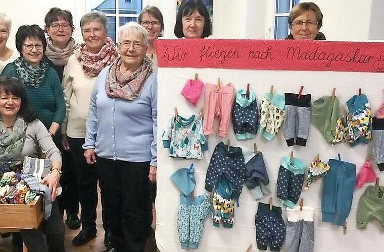 Der Frauenbund nahm diese Not zum Anlass und unterstützt finanziell die "Mobile Hilfe Madagaskar". Schon für zehn Euro kann dort eine Patientin, inklusive Medikamente, versorgt werden. Auf Schautafeln konnten die Besucher viel über dieses Projekt erfahren. Und dann gab es noch eine andere Tafel auf dem Basar, die mit mehreren Wäscheklammer-Reihen bestückt war. Über dem Ganzen prangte in roten Lettern "Wir fliegen nach Madagaskar". Auf dem Basar konnten die Besucher Teile von Baby-Ausstattungen gegen eine Spende erwerben. Das erworbene Stück durfte man dann an den Aufsteller klammern. Diese Ausstattungsteile gehen per Flugzeug nach Ambovo in Madagaskar und helfen in doppelter Hinsicht. Die Mobilität der Hilfsorganisation dort soll ausgebaut werden, um auch in entlegensten Gebieten helfen zu können. Die Spendenaktion am Basar und die Spenden der Frauenbundmitglieder auf der Weihnachtsfeier ergaben 1700 Euro Erlös, die der Aktion "Mobile Hilfe für Madagaskar" zugute kommen. DG