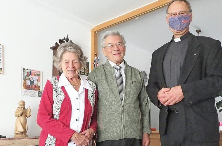 Nicht ganz so wie geplant: Die Gäste, die das Jubelpaar in ihrer gemütlichen Wohnung im Quellenhof besuchten, konnten coronabedingt nur zeitlich versetzt und höchstens paarweise kommen. So war es Bürgermeister Jürgen Kohmann, der mit dem stellvertretenden Landrat Helmut Fischer mit Blumengrüßen und Präsenten den Auftakt machte. Einen guten Tropfen und ein Buchgeschenk überreichte Pfarrer Birkel.