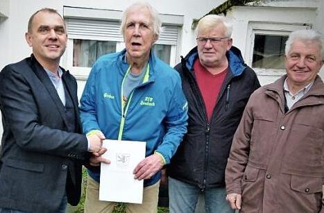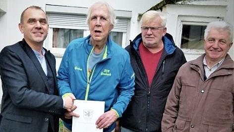 Seinen 80. Geburtstag feierte kürzlich Gerben Sipma. Der aus Holland stammende Jubilar kam 1973 in den Neuenmarkter Ortsteil See, wo er ein kleines Haus erwarb. Beruflich war Sipma in der früheren Spinnerei in Kulmbach tätig, zur Arbeit fuhr er jeden Tag und bei jedem Wetter mit dem Fahrrad. Die Holländer sind passionierte Radfahrer und von daher kommt auch seine Mitgliedschaft zum Radsportverein Concordia Zaubach, der durch Willi Sünkel und Heinrich Witzgall die Glückwünsche überbrachte. Für die Gemeinde Neuenmarkt gratulierte Zweiter Bürgermeister Alexander Wunderlich. Unser Bild zeigt (von links) Alexander Wunderlich, Gerben Sipma, Heinrich Witzgall und Willi Sünkel. Foto: Werner Reißaus
