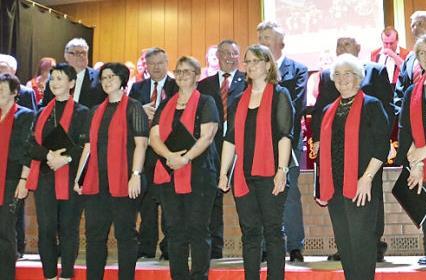 Die Sänger vom Gesangverein unter der Leitung von Karina Klaumünzner begrüßten die Gäste mit dem beschwingten Lied "Wenn Zigeuner Hochzeit machen". Auf diese festlich stimmende Melodie folgten der Marsch "Salmonia" von Kurt Gäble, die Polka "Junge Tenöre" und die böhmisch-mährische Polka "Typisch Edi" von Edwin Sagert. Mit einem Potpourri italienischer Lieder wie "Caprifischer" und "Nicolo, Nicolo, Nicolino" entführte der Gesangverein auf eine Italienreise, begleitet am Klavier von Karina Klaumünzner. Die Blaskapelle erfreute mit dem Walzer "Tranquillo" und der böhmischen "Katharinenpolka". In dem abwechslungsreichen Programm interpretierte der Chor auch "Überall soll Frieden sein". Dann entführten die Jungmusiker ins Disneyland mit bekannten Disney-Melodien. In beeindruckender Weise sang sich der Chor in die Herzen der Zuhörer mit dem Welthit "The rose" von Bette Midler, in Instrumentalbegleitung von Stefan Reuter (Trompete) sowie der Chorleiterin Karina Klaumünzner am Klavier.