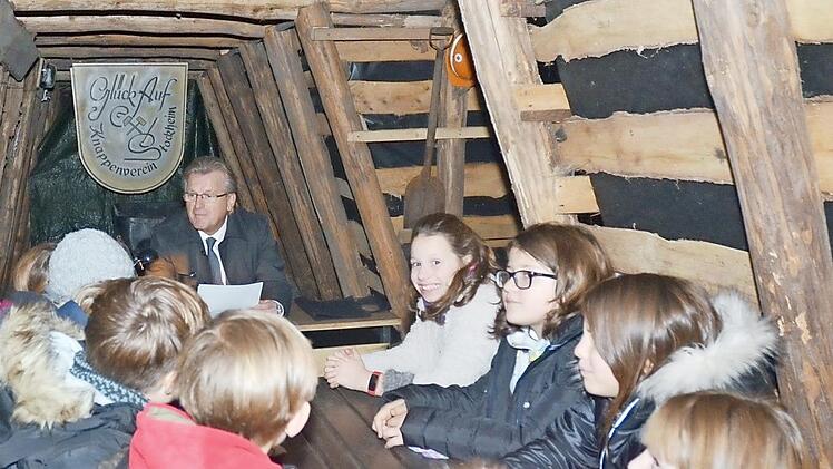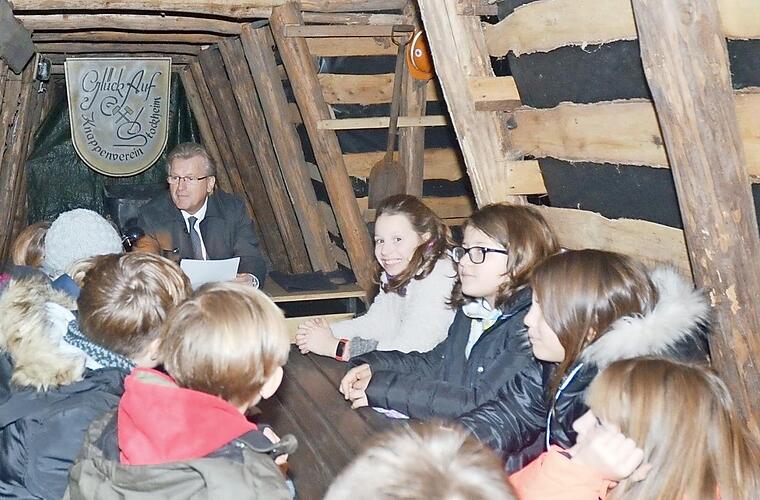 "Geschichten im Schacht" sind eine außergewöhnliche Idee der Grundschule Stockheim zum bundesweiten Vorlesetag unter dem Motto "Natur und Umwelt". Der außergewöhnliche Vorleseort ist ein vom Knappenverein nachgebauter 30 Meter langer und über zwei Meter hoher Bergwerksstollen auf dem Gelände der ehemaligen Steinkohle-Zeche St. Katharina, der an die Steinkohle-Bergbautradition in Stockheim erinnert. Hier las Bürgermeister Rainer Detsch den Grundschülern spannende Geschichten über Dinosaurier vor. Die Betreuer vom Förderverein Bergbaugeschichte Stockheim/Neuhaus hatten zuvor geheizt und schalteten dann auch noch das Licht aus. So erlebte die Klasse 4a mit Rektorin und Klassenlehrerin Astrid Kestel eine ganz besondere Vorlesestunde. Auch alle anderen Grundschüler bekommen in den nächsten Tagen eine Vorlesestunde. Foto: Karl-Heinz Hofmann
