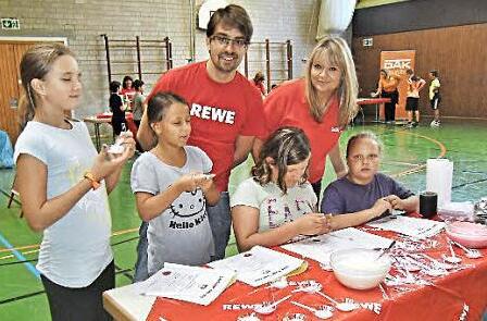Neben Bewegung braucht der Körper auch ausgewogene Kost. Für die Ernährung war der Rewe-Markt zuständig. Ernährungsberaterin Ines Popp appellierte an die Schüler, sich genau zu überlegen, was sie zu sich nehmen: "Esst mit den Sinnen, denn Essen liefert Energie. Es darf beim Essen nicht nur darum gehen, das Hungergefühl zu stillen". Ein Sinnesparcours mit verschiedenen Lebensmitteln veranschaulichte, was gesund ist und worauf man lieber verzichten sollte.
