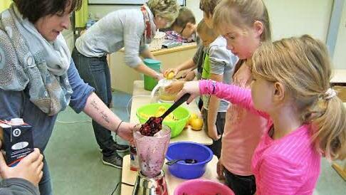 Das muss man sich erst mal auf der Zunge zergehen lassen, was die Kinder der Grundschule Marktschorgast bei der Aktionswoche "Gesunde Ernährung" unter Anleitung des Elternbeirats zubereiteten und kreierten. Sie pressten Saft, zauberten einen Igel aus Birnen in Schokoladenpudding, gingen dem Zucker an den Kragen, führten Geschmackstests durch, bereiteten Smoothies zu und gestalteten Obstschalen. In der Pause gab`s dann ein gesundes Frühstück. Schulleiterin Angelika Gruber dankte dem Elternbeiräten Nadja Günther, Yvonne Walter, Martina Greim und Pia Hartmann-Drechsel.
