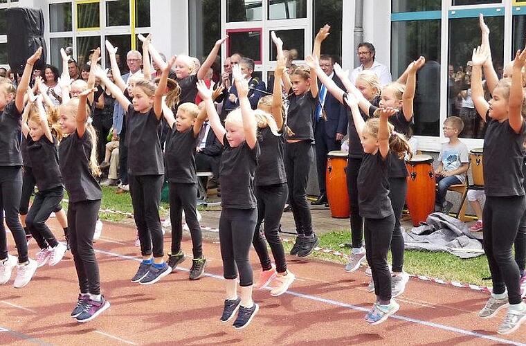 Über 500 Kinder der ersten bis vierten Klasse boten bei der offiziellen Feier auf der Sportanlage ein eindrucksvolles Bild. Mit der Trommelgruppe von Konrektorin Monika Spörlein wurde der offizielle Teil des Festes eingeläutet. Die Chorkinder unter der Leitung von Anja Ruff sangen voller Power das Lied "Friends of the earth". Eine Tanzgruppe hatte mit den Lehrerinnen Katja Rohrmüller und Barbara Maruschke ein Stück einstudiert, bei dem die Mädchen und Jungen als "Roboter" den modernen Bau eines Schulhauses zeigten. Eindrucksvoll präsentierten zudem alle Kinder in einem großen Chor das Lied "Wir sind kleine Helden".