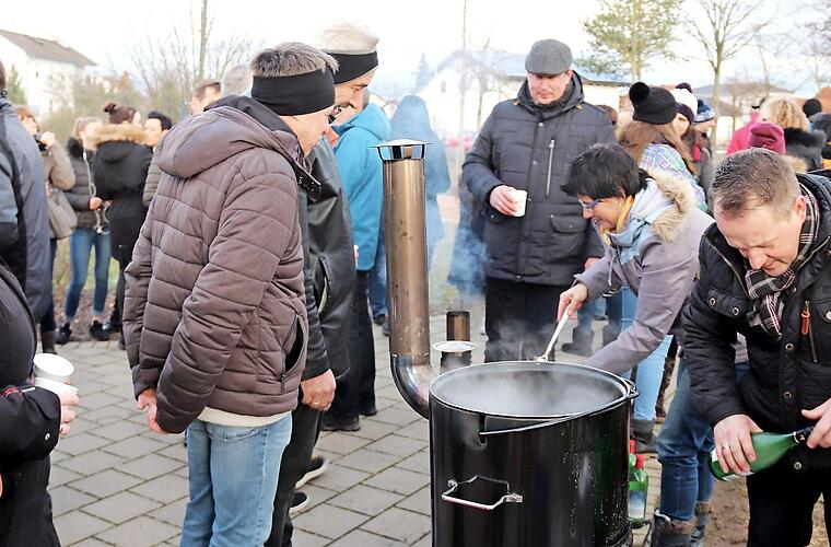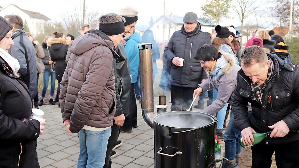 Ein dampfender, holzbefeuerter Topf mit Glühwein, aber auch ein kleinerer mit Kinderpunsch lud Groß und Klein zum Verweilen und Genießen ein. Hans Kuhn war der Glühweinmeister und Anne Gunst seine Assistentin. Einige Frauen hatten selbst gebackene Kuchen und Leckereien mitgebracht. Mit einer Tasse heißen Glühweins konnte man einfach herumstehen, mit dem Bürgermeister und natürlich auch mit Freunden und Bekannten ein Schwätzchen halten. Am Ende hatte Kuhn etwa 350 Becher Glühwein und 250 Becher Kinderpunsch ausgeschenkt.Die Getränke und auch die vielen guten Kuchen gab es wie immer umsonst, jedoch stand ein Topf für großzügige Spenden bereit. Der Erlös ist hauptsächlich für den Seniorennachmittag der Freien Wähler in der Aischgrundhalle am 7. April gedacht.