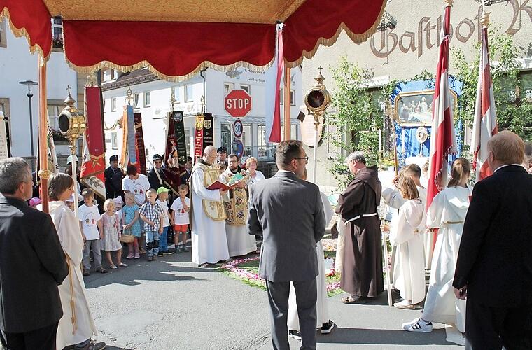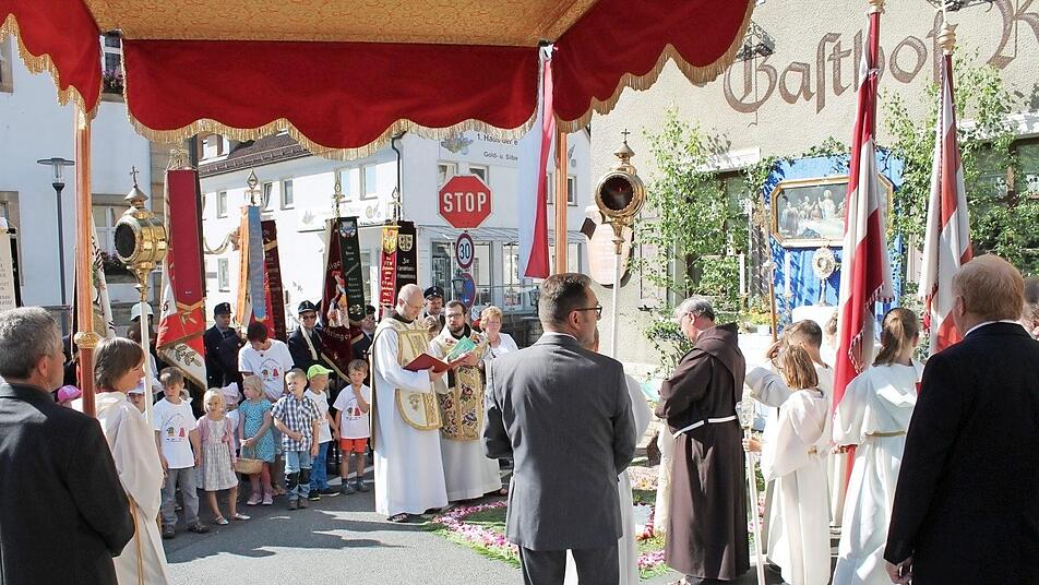 Franziskanerpater David Zmuda zelebrierte den festlichen Gottesdienst. Anschließend trug er gemeinsam mit Pater Igor Rybak den Leib Christi in Form der konsekrierten Hostie in der Monstranz durch die Straßen Gößweinsteins. An vier Altären wurde jeweils aus einem der vier Evangelien gelesen, Fürbitten gehalten und der eucharistische Segen erteilt. Die lange Prozession begleitete der Musikverein Gößweinstein musikalisch.