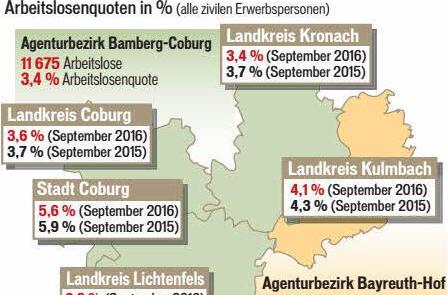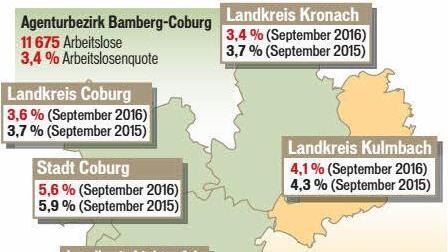 Die Zahl der Arbeitslosen verringerte sich im Landkreis Kronach im September gegenüber dem Vormonat um 46 Personen oder 3,4 Prozent. Der einsetzende Herbstaufschwung wirkte sich hier am stärksten unter allen Kreisen und Städten des gesamten Arbeitsagenturbezirks Bamberg-Coburg aus. Ende September gab es in Kronach 1306 Menschen ohne Job. Gegenüber dem Vorjahresmonat reduzierte sich diese Zahl um 118 (8,3 Prozent).