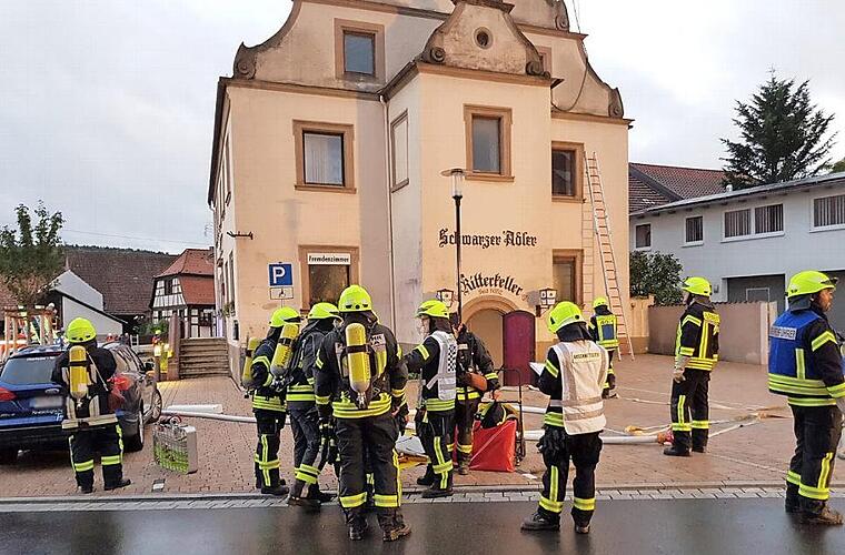 Bei Umbauarbeiten im Ritterkeller der Gaststätte entstand ein Brand mit einer enormen Rauchentwicklung. Dieser breitete sich nach und nach zu einem Vollbrand aus. Mehrere Arbeiter wurden verletzt und konnten nicht mehr ins Freie gelangen. Das war das Übungsszenario, das die Feuerwehren des Marktes Oberthulba im Rahmen der Brandschutzwoche an ihre Leistungsgrenzen brachte. Aufgrund der engen Bebauung am Einsatzort wurden verschiedene Löschwasser-Entnahmestellen festgelegt. Von der nahegelegenen Thulba musste eine lange Schlauchstrecke aufgebaut werden, um das Wassernetz im Ortskern zu entlasten.