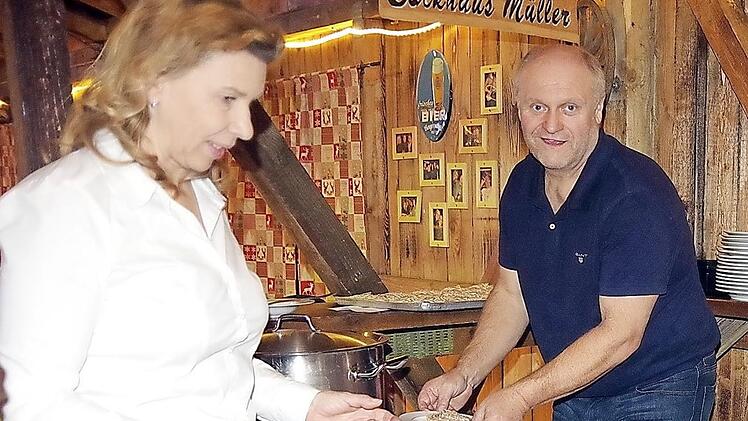Heike Schülein Geschickt balancieren Pfarrer Thomas Teuchgräber, Kerstin Sperschneider, Evi Kohl-Dümlein und weitere Mitglieder des Rotary Clubs Kronach jeweils zwei gut gefüllte Teller mit Gemüsesuppe durch die "Rosenbergalm". Gar nicht so einfach.