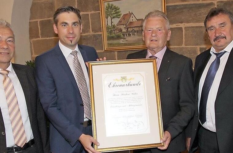 Die Gemeinde Hallerndorf hat einen weiteren Ehrenbürger. Heribert Weber ist in einer Festsitzung im Rathaussaal an seinem 78. Geburtstag die höchste kommunale Auszeichnung von Bürgermeister Torsten Gunselmann (FWG) verliehen worden. Zudem wurde ihm der Titel "Altbürgermeister" zugesprochen.