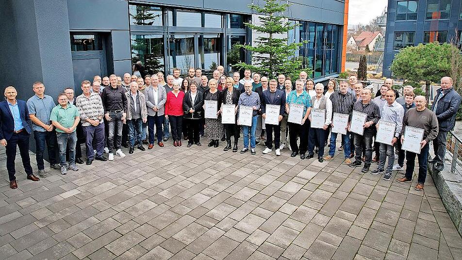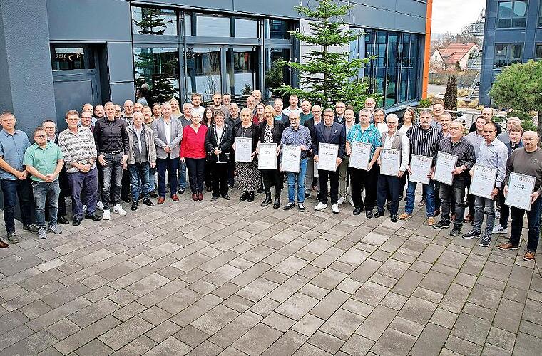 zum 25. Jubiläum : Benjamin Bertl, Dmitrij Devjatov, Robert Fischer , Martin Götz, Bernhard Grießer, Thomas Gundermann, Waldemar Ketschik, Wolfgang Kettler, Michael Klopf, Florian Kraus, Nicole Lehnick, Petra Neeb, Ronny Paasche, Gabriele Rögner, Tino Rottenbacher, Walter Rull und Christoph Sakautzky, alle am Hauptstandort Untermerzbach , sowie Stephan Cichy vom Werk Hausen;