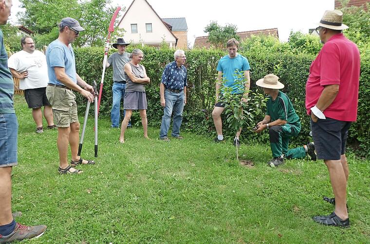 Der August ist nicht der Gartenmonat, in dem die meiste Arbeit anfällt, dennoch gibt es einiges zu tun. So trafen sich vor kurzem die Eberner Gartenfreunde mit dem Gartenexperten Edgar Brohm in einem Garten, um einiges über die im Sommer anfallenden Arbeiten an Obstgehölzen zu hören. Immer häufiger werden Gehölze auch im Sommer geschnitten. Meist geschieht das im Juli oder August, ergänzend zu den Schnitt- und Formierungsarbeiten im Winter. Bei Sauerkirschen , Pfirsichen und Aprikosen kann der Winterschnitt sogar vollständig entfallen, wenn im Sommer richtig und ausreichend geschnitten wird.