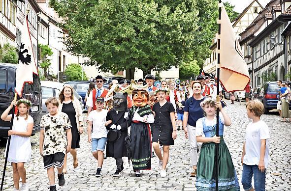 Wenn das Paar, begleitet von Fahnenträgern und der Schulleitung aus dem Rathaustor den Marktplatz betritt, wird es von den Kindern der Schule mit bunten Fahnen und mit Stöckchen, an denen farbige Papierstreifen befestigt sind, mit lustigen Reimversen begrüßt. „Es leb’ der Herr von Katzenkopf mit seiner Frau, die hat kein’ Zopf! Vivat, hoch! Es leb’ der Herr von Ummerstadt mit seiner Frau, die Hunger hat! Vivat, hoch! Es leb’ der Herr von Scheuerfeld mit seiner Frau, die hat kein Geld! Vivat, hoch!“, hallte es wieder zur Begrüßung über den Marktplatz.