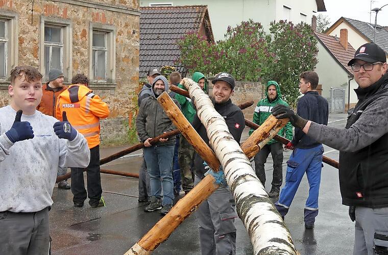 Alles hörte auf das Kommando von Patrick Wagenhäuser, dem stellvertretenden Vorsitzenden des Feuerwehrvereins Steinsfeld . In routinierter Art und Weise, mit viel Manpower und langen Stangen, stellten die Helfer des Feuerwehr-Stammtisches den Maibaum auf. Ein paar Stunden zuvor stand der stolze Baum noch im Gemeindewald, ehe er gefällt wurde. Auf einem Traktor-Anhänger verladen, wurde vom Wald aus ein Umweg über die Nachbardörfer gefahren, ganz nach dem Motto „Schaut her, was wir für einen schönen Maibaum haben.“