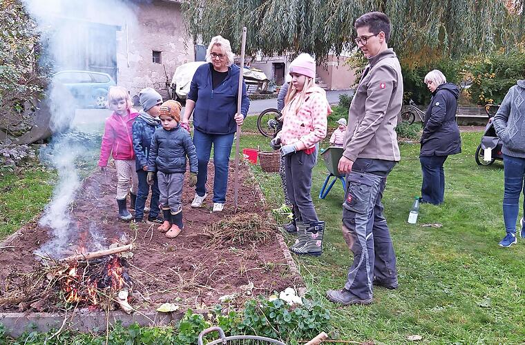 Als Erstes wurde Platz gemacht für eine Feuerstelle, wo später die geernteten Kartoffeln gegart werden sollten. Dann stand Arbeit an, die Kartoffeln mussten aus der Erde. Dank des eifrigen Buddelns der vielen fleißigen Kinderhände wurde bald der Erntekorb gefüllt. Nun kamen die Kartoffeln für etwa 20 Minuten ins Feuer.