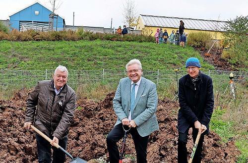Das Baugelände befindet sich unterhalb des Kinderhauses „Wunderland“ – einige Kinder verfolgten aus höherer Warte den Spatenstich, der von Bürgermeister Jürgen Hennemann (SPD), Matthias Hensel und Martin Lang vom Bauamt der VG Ebern vorgenommen wurde. Das Gemeindeoberhaupt freute sich, dass mit dem Neubau der Mehrfamilienhäuser in Ebern Wohnraum zur Verfügung gestellt werden könne. „Wohnraum wird in Ebern dringend benötigt, was in Form von Eigentumswohnungen in den neuen Häusern möglich sein wird“, sagte Hennemann.