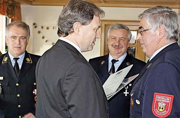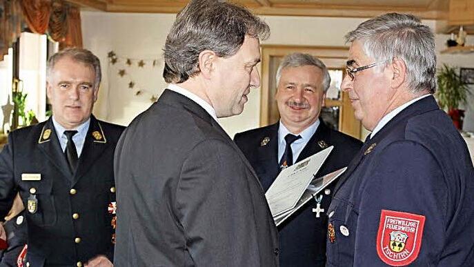 Landrat Klaus Löffler zeichnete in seiner ersten Feuerwehrversammlung im neuen Amt zusammen mit Kreisbrandrat Joachim Ranzenberger die beiden aktiven Wehrmänner Thomas Stark und Josef Zwosta mit dem staatlichen Ehrenzeichen in Gold aus. Beide haben sich in jüngster Vergangenheit besonders bei der Errichtung des Gerätehausanbaues Verdienste erworben. Die beiden Hauptfeuerwehrmänner erhielten auch einen Gutschein für das Feuerwehrerholungsheim in Bayrisch Gmain.