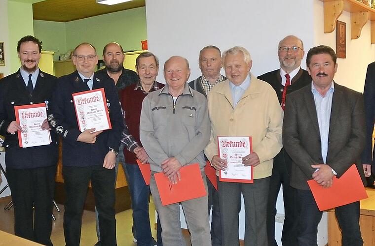 Im besonderen Blickpunkt standen aber die Auszeichnungen mit dem staatlichen Ehrenzeichen in Silber und Gold durch Landratsstellvertreter Wolfgang Beiergrößlein und Kreisbrandrat (KBR) Joachim Ranzenberger. Für 40 Jahre aktiven Dienst wurde Michael Wich das staatliche Ehrenzeichen erster Klasse mit Urkunde in Anerkennung und Dank für seine Verdienste um das Löschwesen verliehen.