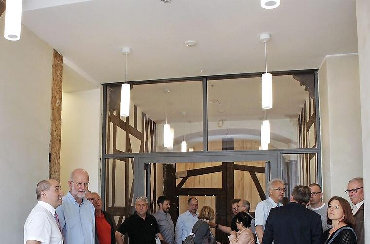 Am meisten vom Umbau betroffen war jedoch der Rathauseingang. Ein enger, dunkler "Kaltbereich", der den Besuchern, die dort warten mussten, kaum zuzumuten war. Jetzt empfängt den Besucher eine ganz andere Atmosphäre. Die Intention sei ein freundlicher, heller, einladender Eingangsbereich gewesen, sagte Bürgermeister Krapp. Durch den neuen gläsernen Windfang, der den einst kalten Gang nach draußen abschirmt, könne im Sommer auch das große Tor offen stehen. Wodurch signalisiert werden solle, dass die Bürger im Rathaus willkommen sind. Deshalb sei auch versucht worden, möglichst viel Glas zu verbauen.