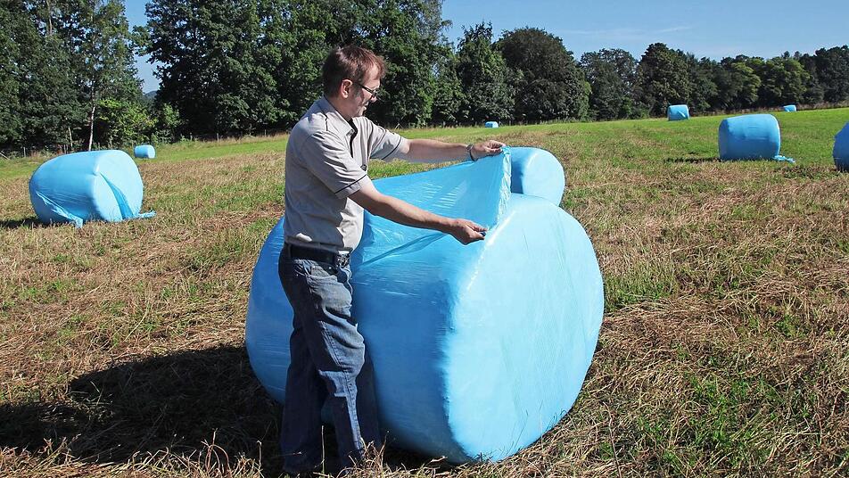 Herbert Hanna informierte über die Farbtupfer auf den Feldern. Die in weiße oder grüne Folie eingewickelten Ballen kennt man ja schon. Doch jetzt leuchtet ein frisches Blau von den abgeernteten Wiesen bei Fröschbrunn. Herbert Hanna hatte die Wahl, ob er pink oder hellblau nehmen sollte. Pink war ihm dann doch etwas zu bunt, deshalb orderte er etliche Paletten hellblau.