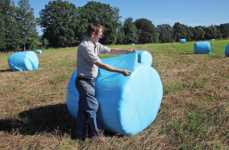 Sie sind ein Hingucker, die hellblauen Ballen, die Alexander Hanna aus Fröschbrunn um Heu- und hauptsächlich um Silageballen wickelt. Und das Ganze dient noch einem guten Zweck, denn ein Teilerlös geht an die Krebsforschung.