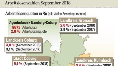 In der Stadt Coburg setzte die Herbstbelebung am Arbeitsmarkt bereits leicht ein. Die Zahl der Arbeitslosen sank um 15 Personen ( - 1,3 Prozent) auf 1165. In den letzten zwölf Monaten schrumpfte die Arbeitslosigkeit um 36 Personen oder 3,0 Prozent. Es verloren 18,8 Prozent weniger Menschen ihre Beschäftigung als im Vorjahresmonat. Die Arbeitslosenquote reduzierte sich auf 5,1 Prozent (Vorjahr 5,3 Prozent).