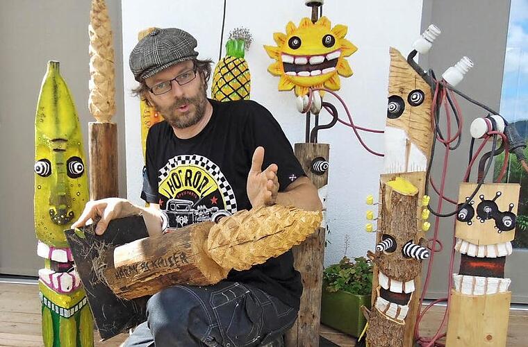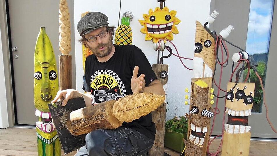 Mit der Motorsäge verwandelt Hardy Kaiser Holz in farbenfrohe und dabei anspielungsreiche Skulpturen. Einige seiner Werke hat der 44-Jährige jetzt in Ermreuth ausgestellt.