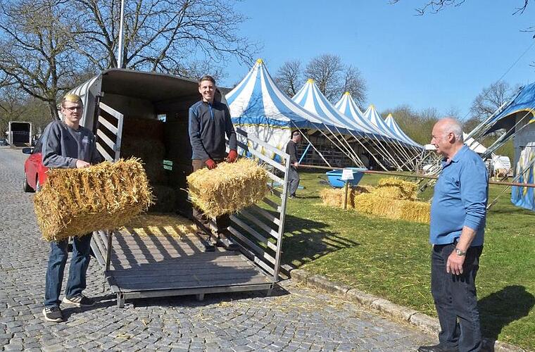 Die beiden Spender kommen gerade mit den nächsten Ballen im Arm heran und werfen sie auf den Stapel. "Wenn alle zusammenhelfen, dann schaffen wir das schon", sagt Kevin Raab. Zusammen mit Toni Hübner lädt er gerade rund 80 Ballen Heu und Stroh für den Zirkus ab.