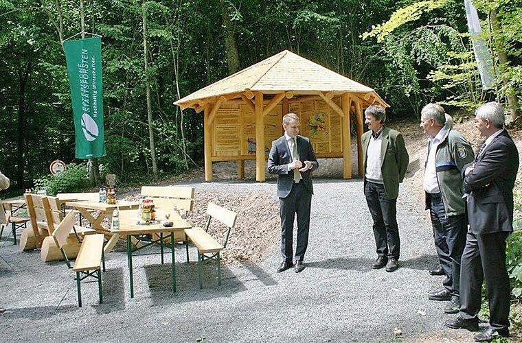 Neben Maßnahmen im Bereich Zabelstein und Ebrach-Handthal setzte die Bayerische Forstverwaltung auf Anregung von Altbürgermeister Georg Bogensperger nun einen weiteren Schwerpunkt zur Information in Burgebrach, wie Forstbetriebsleiter Ulrich Mergner bei der offiziellen Übergabe sagte. Das Gebäude selbst wurde unter Projektleitung von Forstwirtschaftsmeister Dietmar Herold konzipiert und gestaltet.