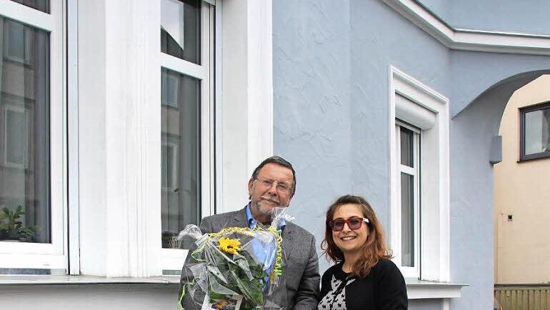 Galia Gülcan Tunakan sind die Freude und Dankbarkeit anzumerken als sie die Sanierungsmedaille von Hans-Heinrich Eidt entgegennimmt. Sie ist die Eigentümerin des Hauses Victoriastraße 6, dessen Renovierung von der Gemeinschaft Stadtbild
