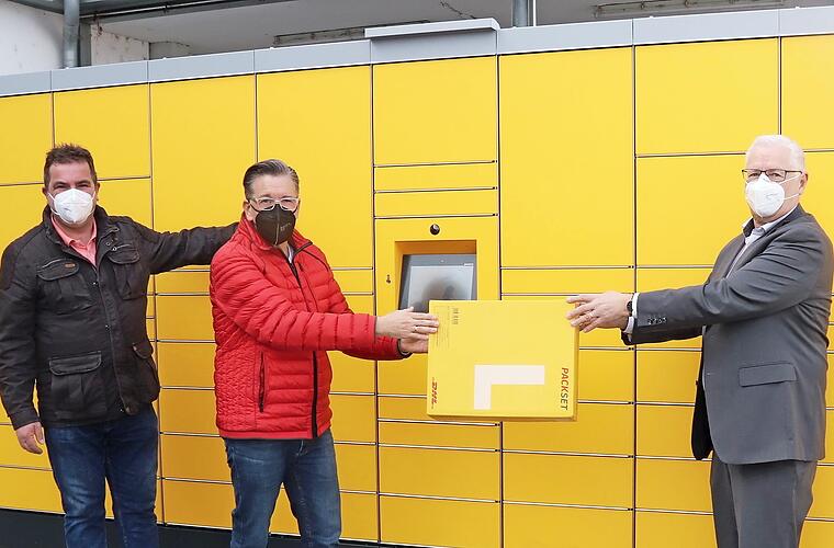 Adelsdorf — Die neue Packstation der Bundespost in der Hochstraße 21 in Adelsdorf wurde ihrer Bestimmung übergeben. Helmut Muhr, Regionaler Politikbeauftragter der Deutschen Post AG aus Ingolstadt und Klaus Zametzer, Qualitätsmanager der Deutsch Post-AG aus Forchheim - der Mann mit der goldenen "Sesam-öffne-dich-Karte" - trafen sich mit Bürgermeister Karsten Fischkal (FW) am neuen Standort . Fischkal freute sich, als er zu seiner Überraschung und zum Testen ein Päckchen aus einem Fach abholen konnte, wobei er das System kennenlernte. "Das ist ja ganz einfach!", schwärmte er.