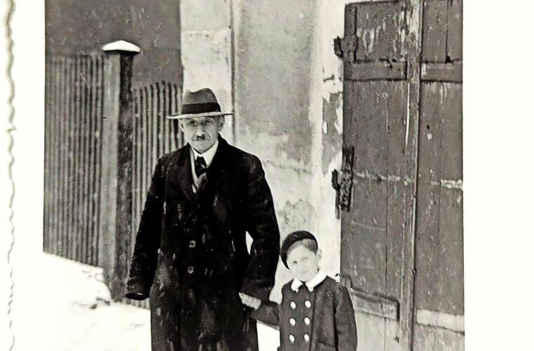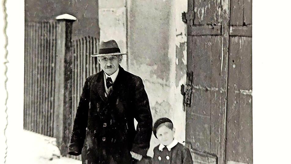 Die Fotografie von etwa 1949 zeigt Albert Schloß vor seinem Wohnhaus in Mühlhausen, zusammen mit dem etwa sechsjährigen Ralf Kriegel, dem Enkel von Frau Preussner, die eine Freundin der Eheleute Schloß gewesen ist.