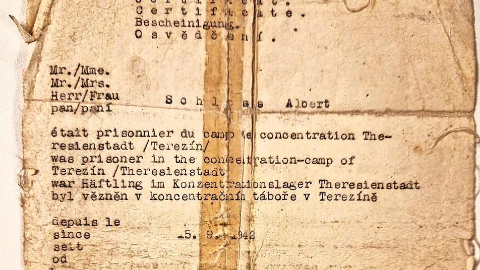 Otto Pröls hat ein historisches Dokument dem Verein Forum Alte Synagoge Mühlhausen übergeben, der es in sein Archiv übernommen hat. Es handelt sich um den Entlassungsschein von Albert Schloß aus dem Konzentrationslager Theresienstadt, der auf den 15. August 1945 datiert ist.