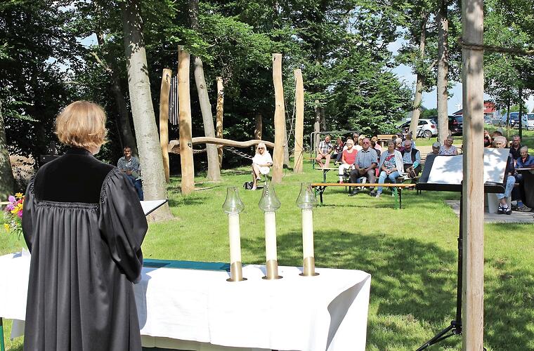 Mit der Eröffnung zu warten, bis die Landesregierung endlich grünes Licht für ein größeres Fest gibt, dauerte Bürgermeister Klaus Faatz ( CSU ) zu lange. Da bot sich der „ Gottesdienst im Grünen“ an, den die Kirchengemeinden Mühlhausen und Weingartsgreuth jeweils im Wechsel feiern. Obwohl die Sonne während des Gottesdienstes schien, stand er ganz unter dem Eindruck der Bilder der schrecklichen Überschwemmungen im Westen Deutschlands. Pfarrerin Kathrin Seeliger erinnerte in Gebeten und Predigt an das Ausmaß der Katastrophe und die Not der betroffenen Menschen. Aufbauend auf die Botschaft der Bibel vermittelte sie jedoch Zuversicht: Selbst in bitterster Zeit zeige Gott Wege auf. Und er könne Engel schicken. In der Flutkatastrophe sei dies vielleicht „ein Engel im Neoprenanzug“, der mit dem Helikopter unterwegs sei, um Menschenleben zu retten.
