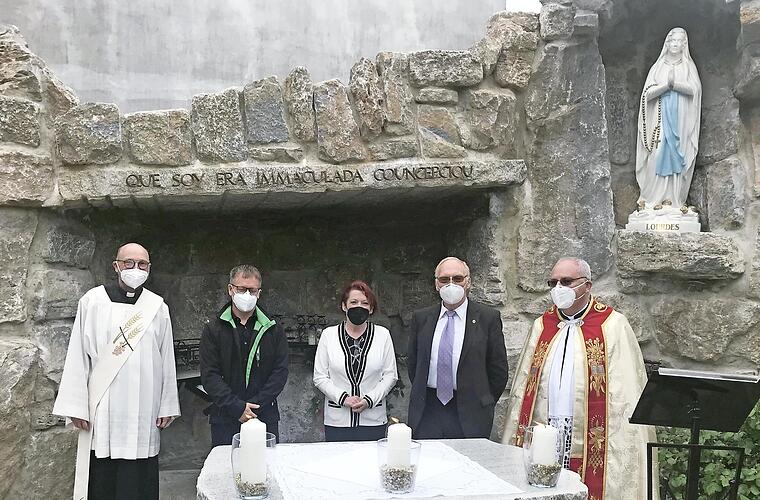 Die sonst am Sonntag nach Fronleichnam übliche Prozession endete heuer mit einem Gebet und dem Segen an der Lourdesgrotte, wo sich seit Ausbruch der Pandemie im März vergangenen Jahres täglich Menschen zum Gebet in den verschiedenen Anliegen der Corona-Krise versammeln. Dorthin wurden auch die drei entzündeten Kerzen von ihren „Paten“ getragen. Die Musik der Höchstadter Stadtkapelle umrahmte die Gedenkfeier . LM