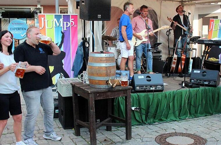 "Das Schillerplatzfest sticht doch den Berch aus, und dann noch ,Jump5‘ auf der Bühne. Das ist doch einfach super", erklärte ein begeisterter Besucher. "Hier ist es viel schöner und vor allem gemütlicher", fügte ein anderer an. Der Platz füllte sich schnell und "Jump5" begann den Abend mit Musik aus den 60er und 70er Jahren. "Wir versuchen einfach, den eigenen Spaß an der Musik rüberzubringen," so begrüßte Michael Ulbrich, der Keyboarder der Band und hauptberuflich Rektor der Ritter-von-Spix-Schule, die vielen Gäste. "Schön, dass ihr euch bewusst gegen den Berg und für den Schillerplatz entschieden habt. Ein dickes Kompliment auch an Markus und Elena, dass ihr es trotz Berg gewagt habt - mit Erfolg!"