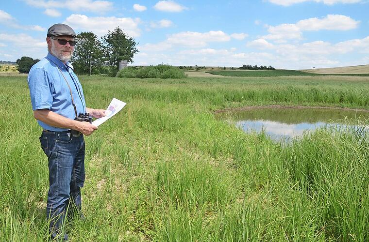 Während sich der Biologe einen Weg durch die Großseggen bahnt, die im Coburger Land auch nicht eben häufig anzutreffen sind, erwähnt er die Trollblume und die Sumpfdotterblume und betont, dass auch das Großseggenried gesetzlichen Schutz genießt. Dabei spielt sich am Himmel ein Luftkampf ab. Ein Kiebitzpaar attackiert einen Turmfalken. "Das ist interessant. Es lässt vermuten, dass die Kiebitze noch brüten", sagt Frank Reißenweber. Sie sind damit spät dran. Es könnte sich um eine Nachbrut handeln, weil ihr erstes Gelege zerstört wurde. Kiebitze kamen früher an geeigneten Standorten des Coburger Landes in Massen vor. Heute findet jedes einzelne Paar Beachtung. Symptom eines starken Rückganges der Zahl der Wiesenbrüter. Die ausgedehnte Extensivfläche zwischen Stadtrand und Unterlauter bietet da eine erfreuliche Vielfalt, nicht nur an Wiesenbrütern. Neben Kiebitzen, Bekassinen und dem Wachtelkönig, wurden hier auch Neuntöter Wiesenpieper, Braunkehlchen und Blaukehlchen bestätigt. Während die Kiebitze mit dem Falken beschäftigt sind, zieht unbehelligt ein Rotmilan über einer gemähten Wiese Kreise, die an das extensivierte Gebiet angrenzt. "Da kommt er gern zum Jagen hin, der Weißstorch übrigens auch", sagt Frank Reißenweber und erreicht einen kleinen Tümpel im Seggenried. Das ist nur nach einer Trockenperiode wie in den vergangenen Wochen möglich. Sonst wäre es zu sumpfig. "Das Kleingewässer wurde 2017 vom Landschaftspflegeverband Coburger Land angelegt", erklärt er. Über den Verband wurden auch kleine Staustufen in den Lauter-Überleiter gebaut. Er führt nur an wenigen Tagen im Jahr Wasser, wenn die Lauter droht, die Stadt zu überfluten. Die Staustufen halten dann über eine gewisse Zeit kleine Tümpel, damit das Wasser nicht zu schnell aus dem Gebiet verschwindet, das sonst nur vom Kleinbach feucht gehalten wird, der sich unter dem Damm der Autobahn hindurch herüberschlängelt. Unbemerkt hat sich der Rotmilan unterdessen verzogen. Dafür ist sein Verwandter aufgetaucht, der Schwarzmilan. Bei uns ist eines der bedeutendsten Vorkommen des Rotmilan in Europa, erklärt Frank Reißenweber, und es kommen beide Arten vor. Als die Eindringlinge das Seggenried verlassen, zeigt sich wenig später noch eine andere Art. Eine Rohrweihe hatte sich trotz unserer Nähe dort versteckt. Auch sie hat dort wohl ihren Nachwuchs.