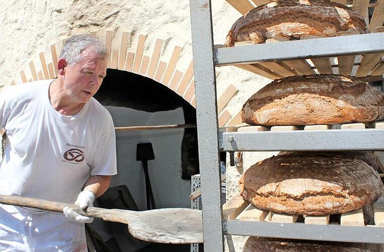 Helmut Hofmanns Gesicht ist schweißgebadet. Heiß ist an diesem Nachmittag nicht nur das Wetter, sondern auch der Backofen, in den sich der Bäcker langsam hineinbeugt. 300 Grad ist es darin - ideal zum Brotbacken. Mit der Ofenschaufel in der Hand greift Hofmann tief in den Ofen, holt daraufhin braun gebackene Brote heraus, eins nach dem anderen. Dabei muss sich der Bäckermeister beeilen: Die meterlange Schlange, die sich am Verkauf gebildet hat, reicht fast bis auf die nächste Straße. Der Andrang um die "Roggerla", dem fränkischen Bauernbrot, ist groß beim ersten Backofenfest in Thelitz.