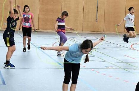 Auch die Anton-Wölker-Schule beteiligte sich am kostenlosen zweistündigen Basiskurs der Deutschen Herzstiftung, und den Kindern der Klasse 4 a von Lehrer Reinhard Seeger wurde spielerisch die sportliche Form des Seilspringens, das "Rope Skipping", nahe gebracht.