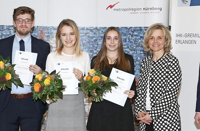 Als Prüfungsbeste wurden folgende Auszubildende ausgezeichnet: Mona Eichner, Industriekauffrau (Framatome, Erlangen), Dennis Lähn, Kaufmann im Einzelhandel (Müller, Erlangen), Luise Raum, Kauffrau für Büromanagement (Siemens, Erlangen).