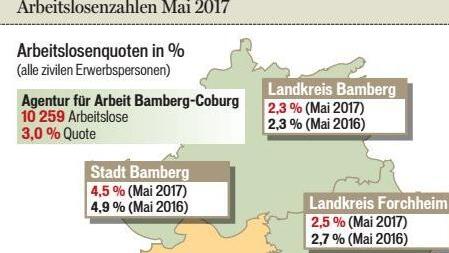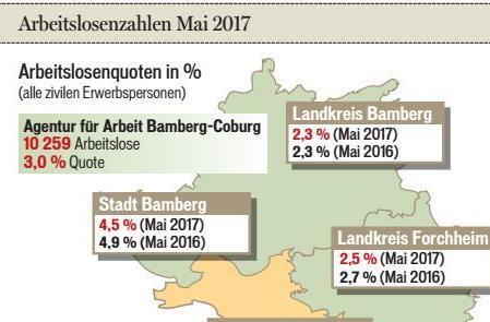 Nur im Landkreis Bamberg liegt sie ungefähr (+0,6 Prozent) auf dem Wert vom Mai 2016. Der Landkreis verzeichnet mit 2,3 Prozent jedoch die niedrigste Arbeitslosenquote im gesamten Bezirk.