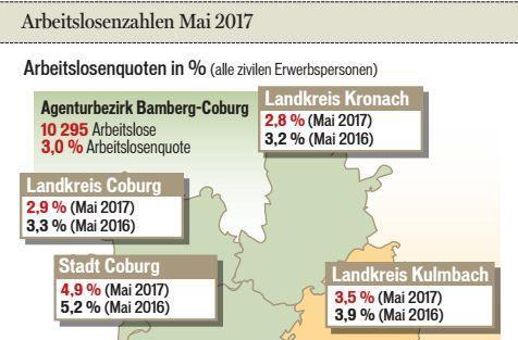 Im Wonnemonat Mai sank im Agenturbezirk Bamberg-Coburg die Arbeitslosigkeit aufgrund der florierenden Wirt-schaftslage um 434 (-4,0 Prozent) auf 10 295 Personen. Zum Vergleich: Im April, als nach der Winterpause noch viele Betriebe ihre Mitarbeiter wieder einstell-ten, verringerte sich die Arbeitslosigkeit im Agenturbezirk um 1006 Personen (-8,6 Prozent). In den vergangenen zwölf Monaten reduzierte sich die Zahl der Arbeitslosen um 823 Personen bzw. 7,4 Prozent. Die aktuelle Arbeitslosenquote beträgt 3,0 Prozent und sank somit im Mai wieder auf die Marke zur Vollbeschäftigung. Vor einem Jahr lag sie bei 3,3 Prozent. Der Agenturbezirk Bamberg-Coburg erreichte im November 2016 seit seinem Bestehen erstmals die 3,0-Prozent-Grenze zur Vollbeschäftigung.
