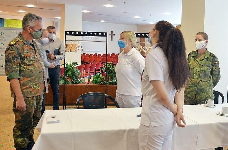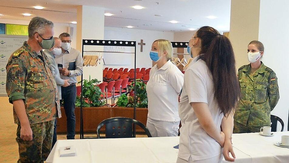 So wurde der Medical Park über vier Wochen durch Soldatinnen und Soldaten unterstützt. Wie das gelaufen ist, wollte Generalarzt Bruno Most wissen, der am Donnerstag die Einsatzkräfte in Bad Rodach besuchte. Am Freitag hatten sie für diesen Einsatz ihren letzten Tag. Most würdigte den Einsatz in Bad Rodach: "Ich bin begeistert, wie gut es gelingt, in kürzester Zeit Kräfte in zivilen Einrichtungen zu integrieren."